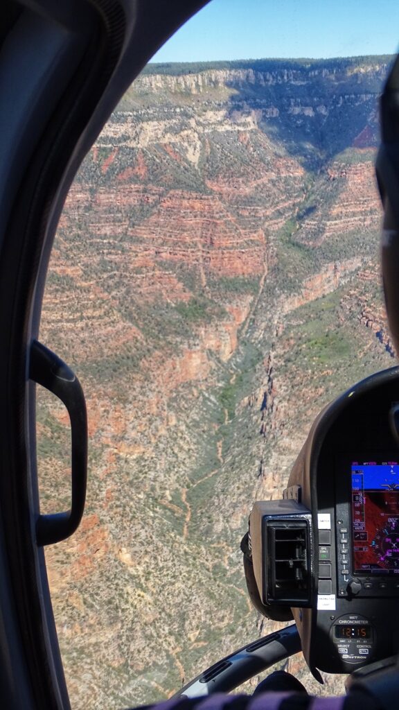 Om de grootsheid helemaal te ervaren besluiten we een helikoptervlucht te maken. Met de aanzwellende muziek à la Once upon a time in the west door onze koptelefoon naderen we de canyon. Magistraal om dit van bovenaf te zien, er deels doorheen te vliegen en de donkere en lichte kleuren afgewisseld te zien. Het blijft moeilijk bevatten maar het immense van de grand canyon komt van bovenaf nog meer binnen.