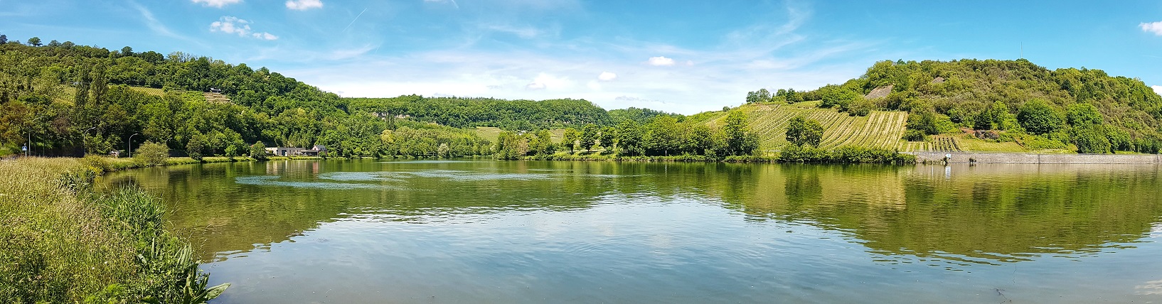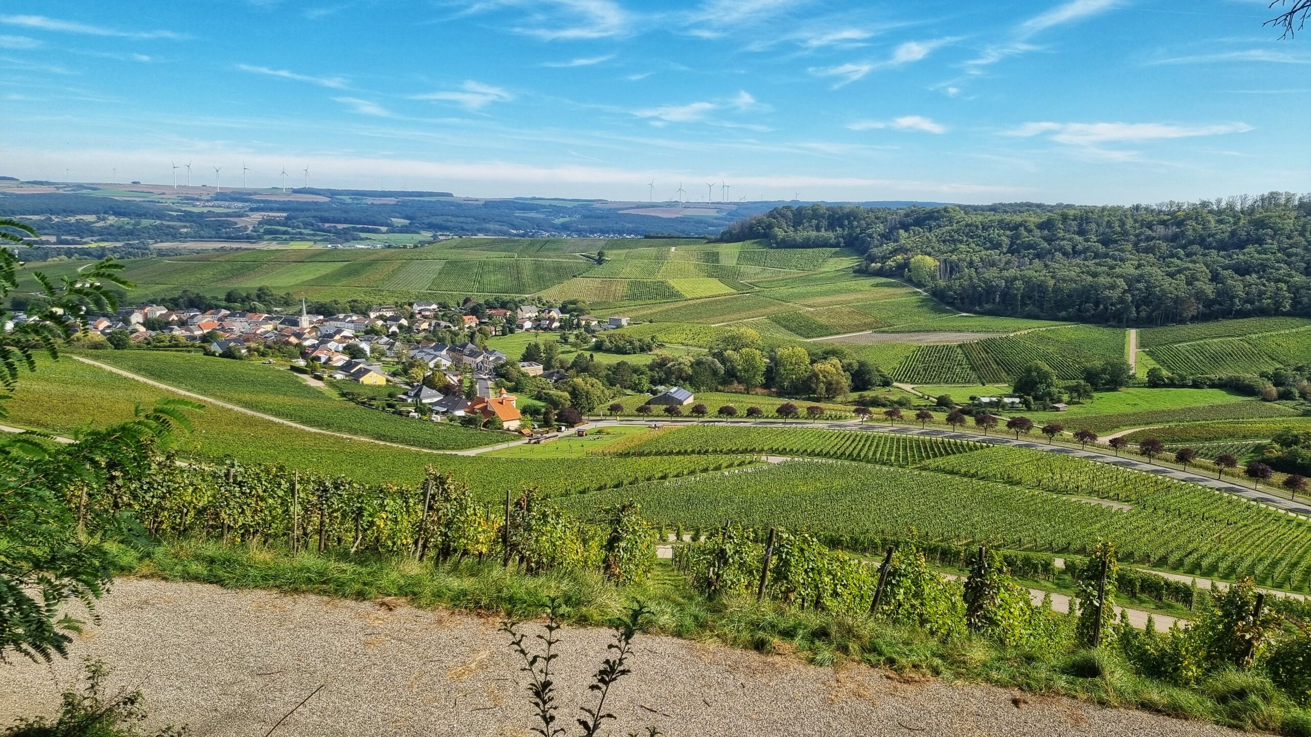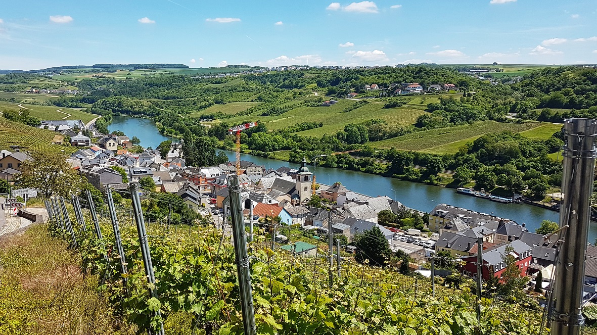 Volg je de Moezel verder naar Stadtbredimus, ga dan de heuvel op bij Wormeldange-Haute. Ook hier een fantastisch uitzichtpunt! De wijnvelden spreiden zich van links tot rechts voor je uit, tot aan het dorpje beneden aan de Moezel. De blauwe rivier de Moezel stroomt mooi en met lichte bochten door het groene landschap.